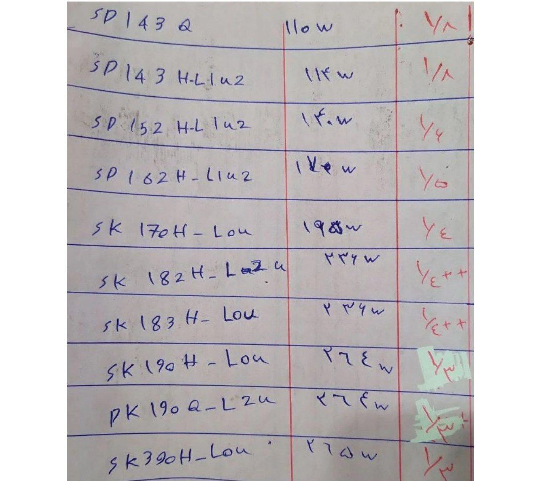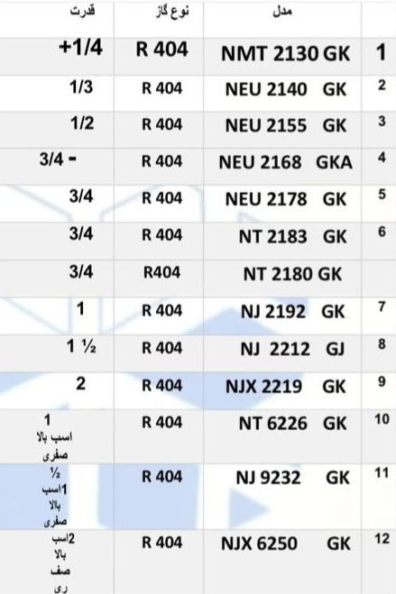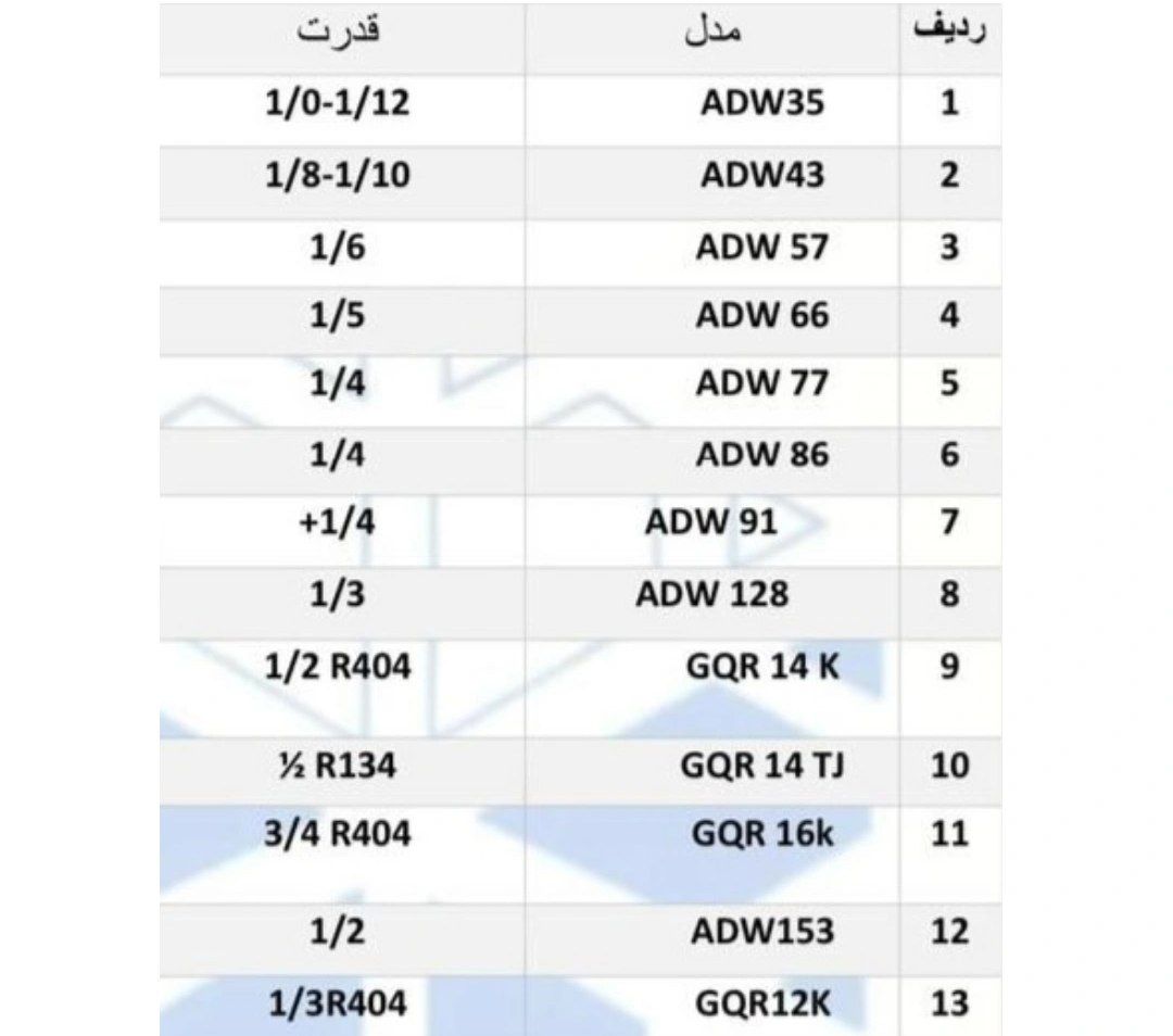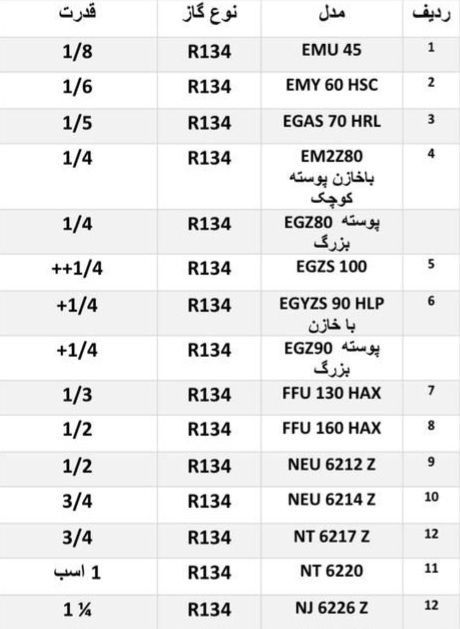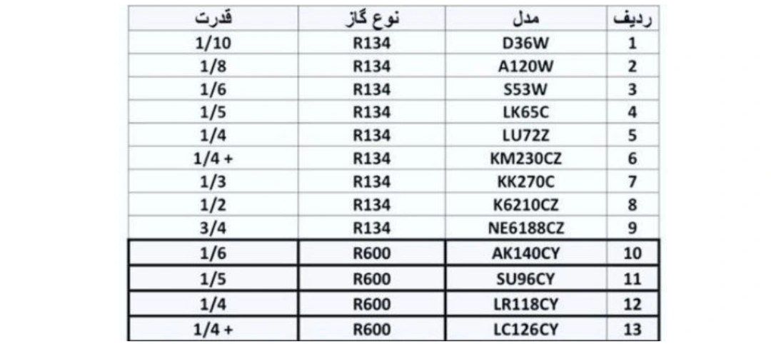 در تصاویر زیر میتوانید نمونهای از تطابق کد کمپرسورها با توان آن را مشاهده کنید: